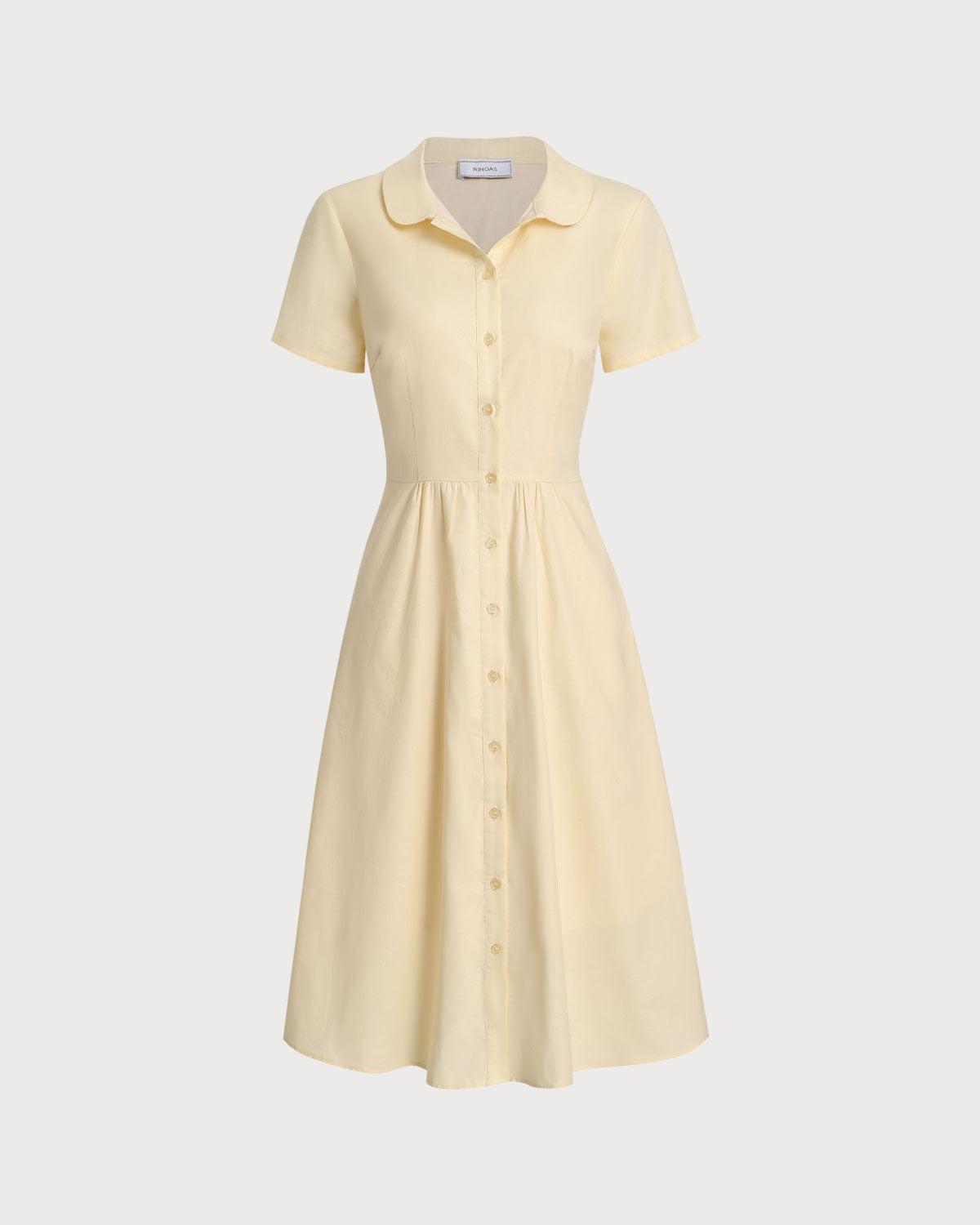 Fabric:This Short Sleeve Midi Dress is made of Cotton. Cotton fabric features humidity balance, durability, and eco-friendly nature, feeling soft but not stiff when touching the skin. Description:Featuring a vibrant yellow hue and a row of stylish front buttons, this dress offers a playful yet elegant look. The short sleeves provide comfort, while the midi length adds a touch of sophistication. Details:- Occasion: Office wear- Style: work- Fabric Stretch: No Stretch- Waist: Natural Waisted- Embellishment: Button, Pockets- Silhouette: A-Line- Fabric: Cotton 70.0%, Linen 30.0%- Lining: Polyester 100.0%