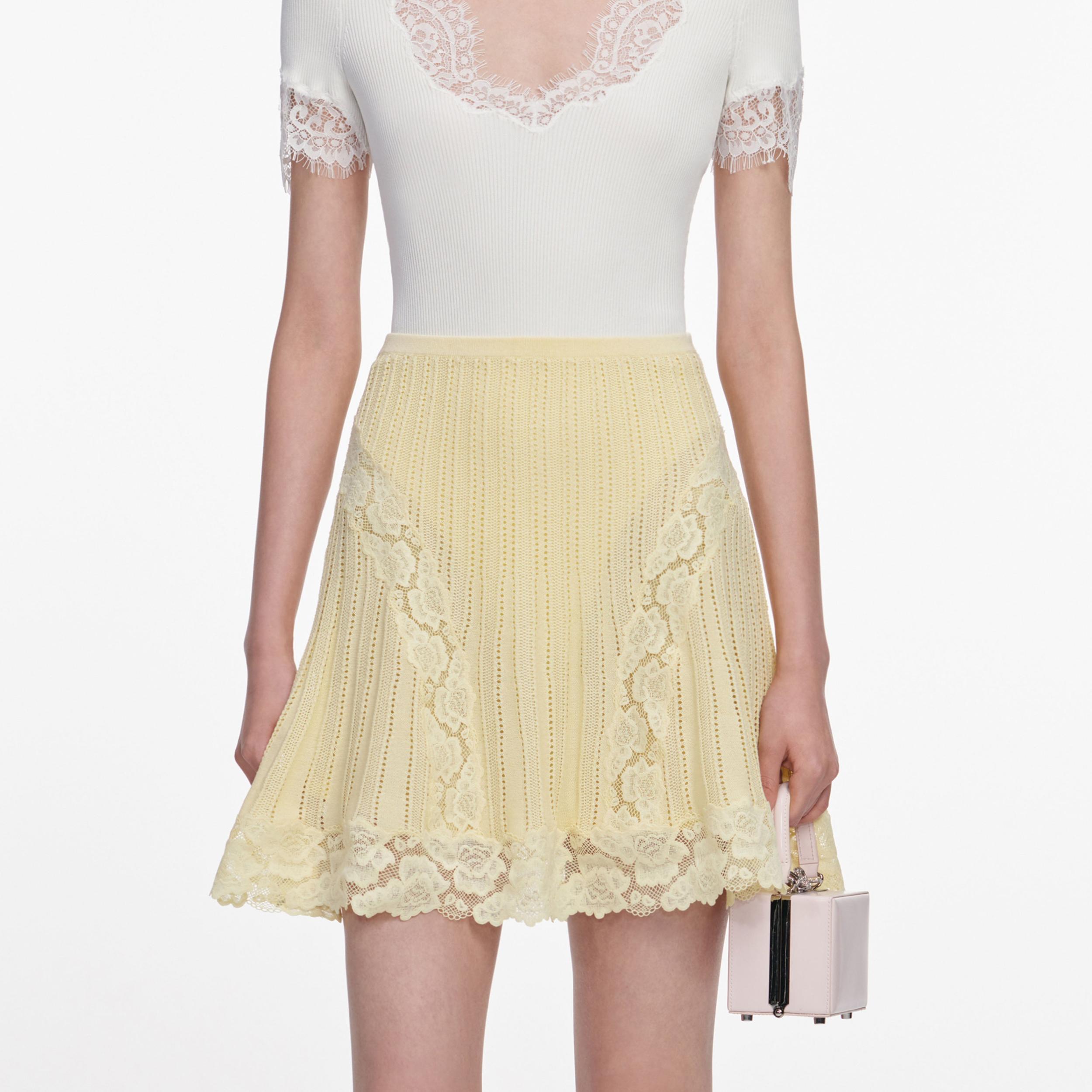 Full of romance, lace detailing lends light-hearted ease to this yellow knit mini skirt. Its flared hem plays well with flats and heels alike – pair with our matching cardigan for a stylish set. True to sizeFabric has stretchElasticated waistbandScalloped hemMatching cardigan availableModel is 5ft10/178cm and wears a size S