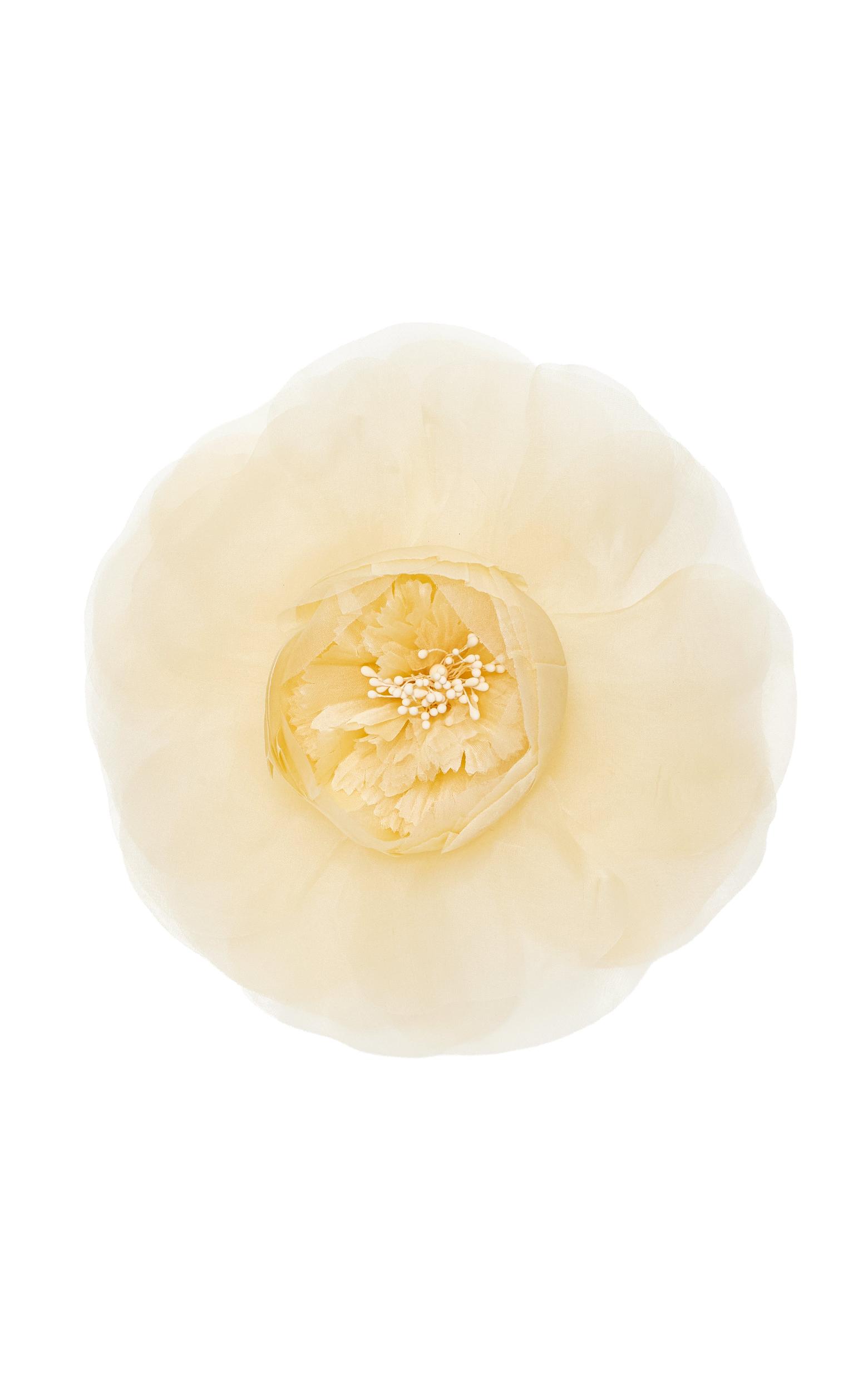 Cut from pastel yellow silk satin face and silk organza, this beautiful flower pin is a perfect accent to any look. Measures approximately 5" in diameter with a bar pin closure.