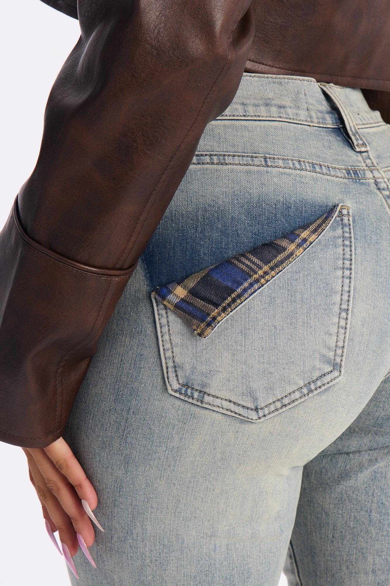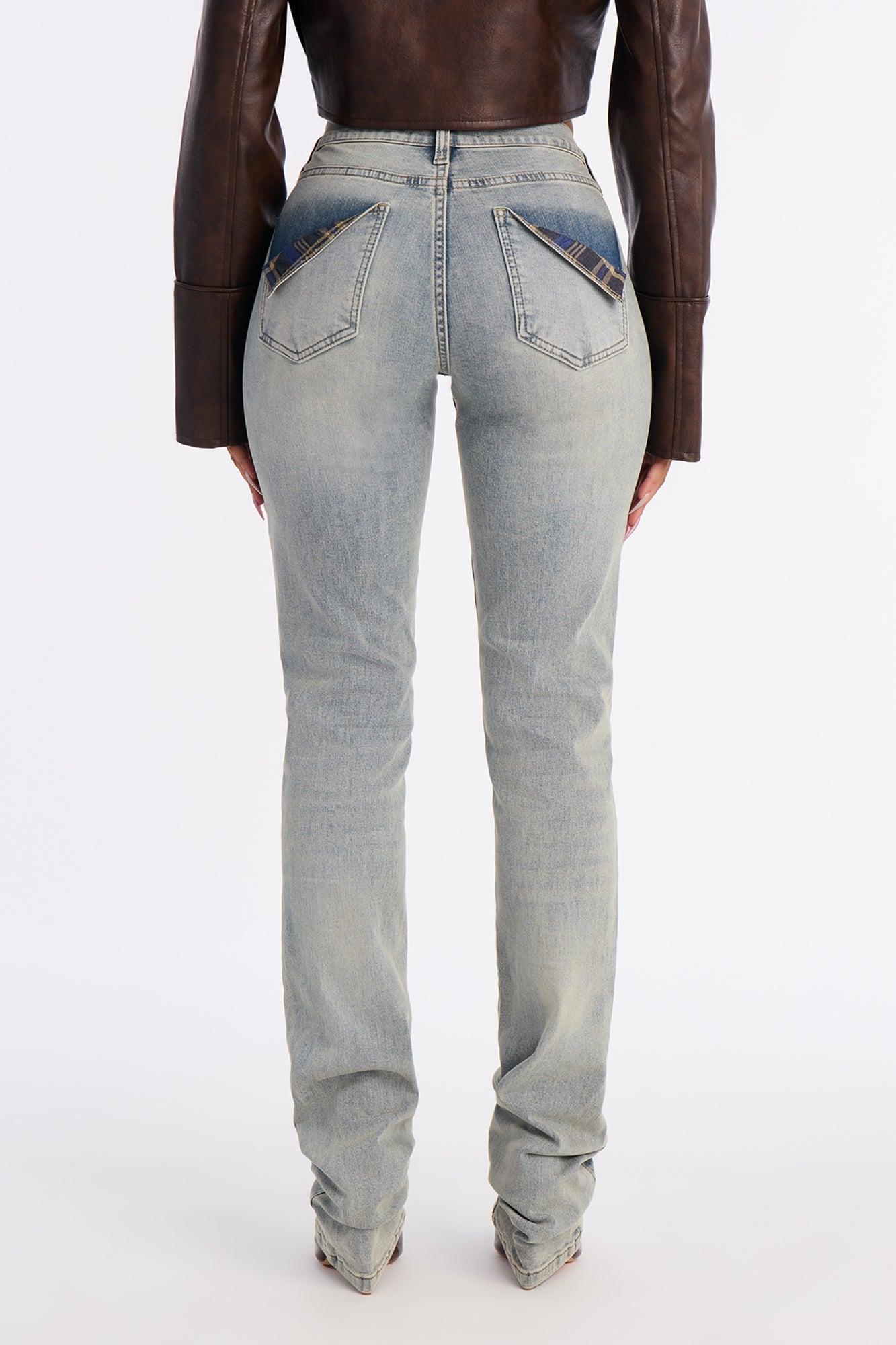 Available In Vintage Wash. Skinny Jean 5 Pocket Plaid Trim Pocket Detail Stacked 8.5" Rise 39" Inseam Medium Stretch Disclaimer: Due To The Specialized Wash & Distressing Process, Each Garment Is Unique 98% Cotton 2% Spandex Imported
