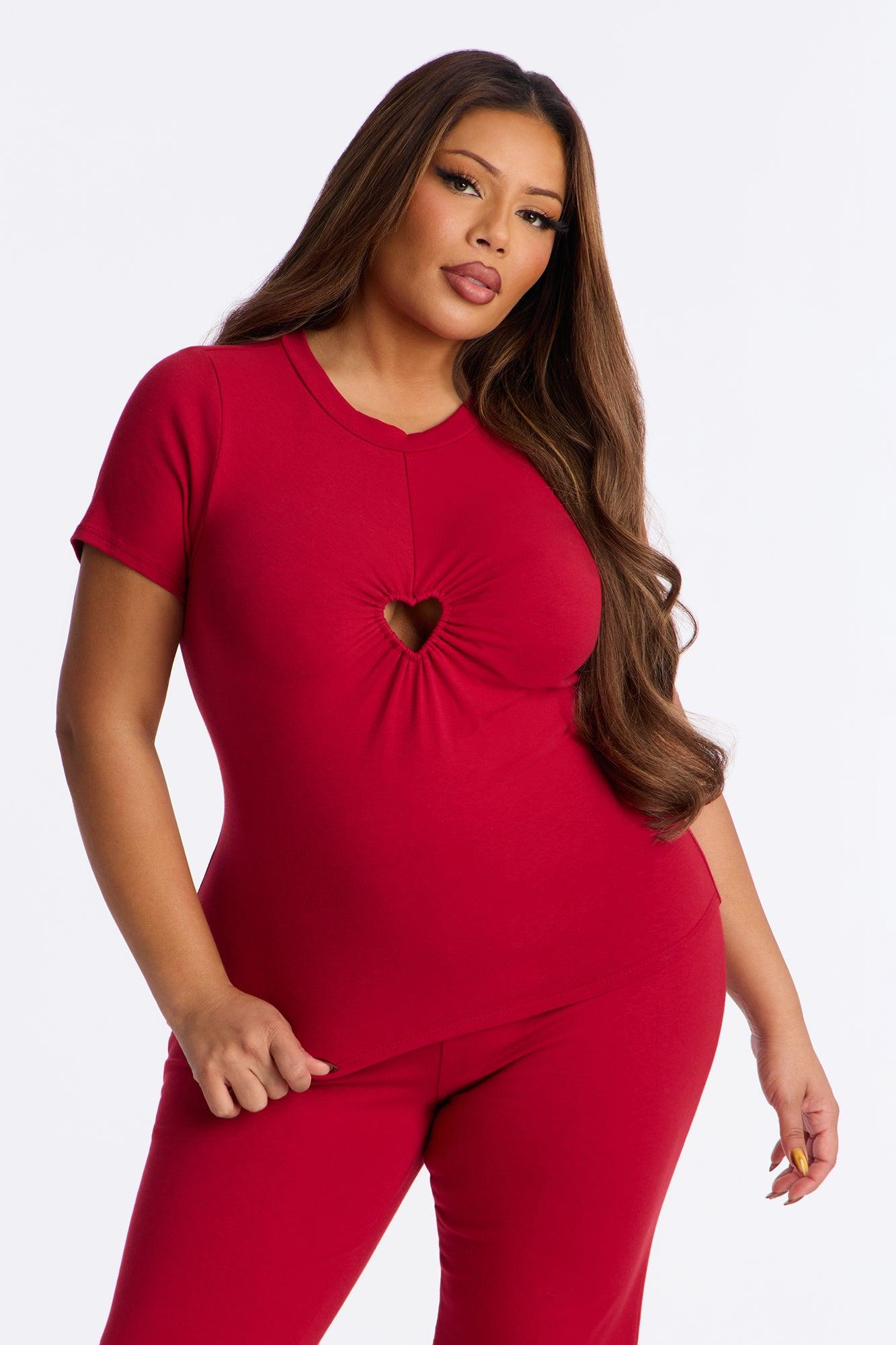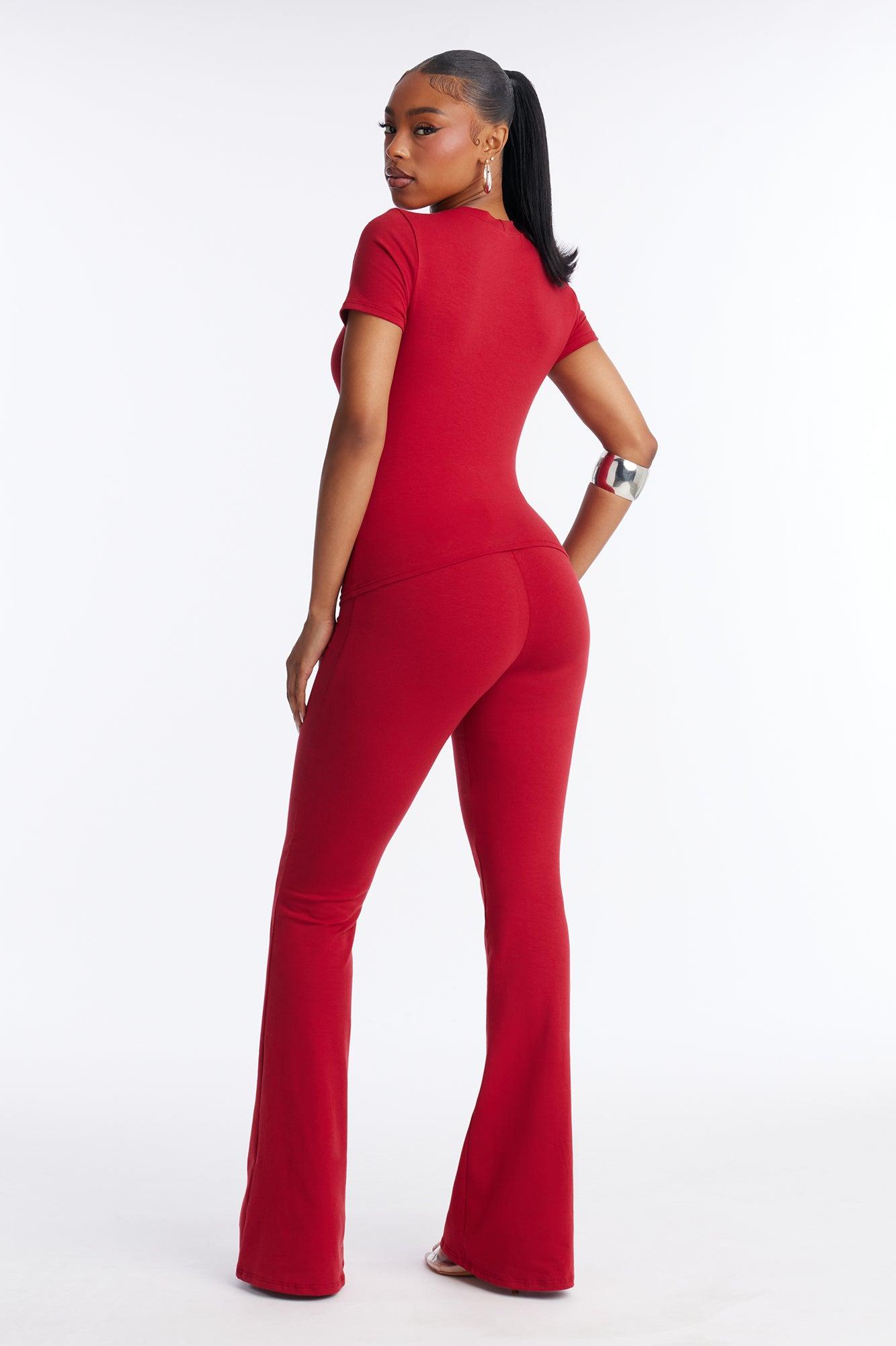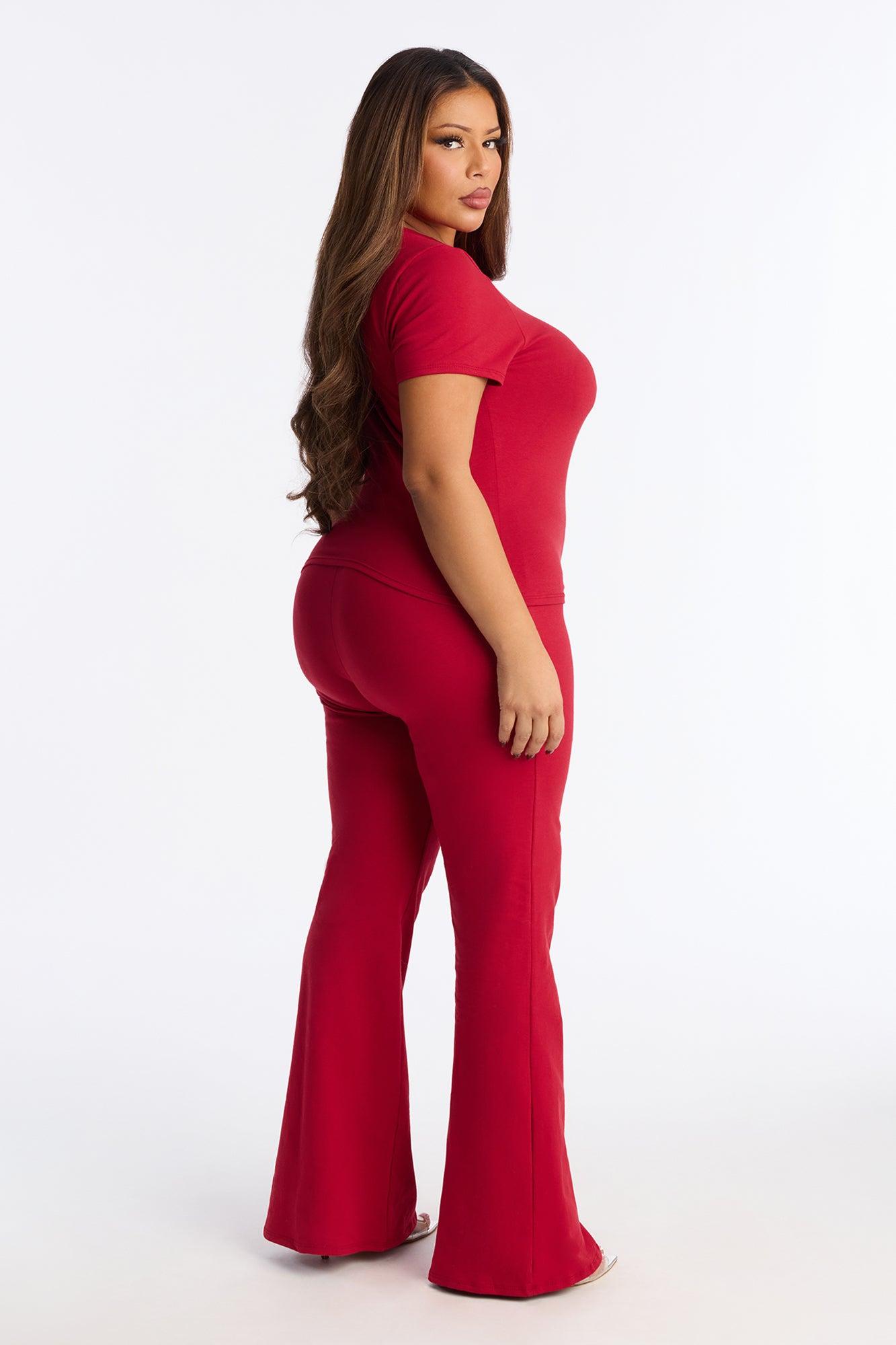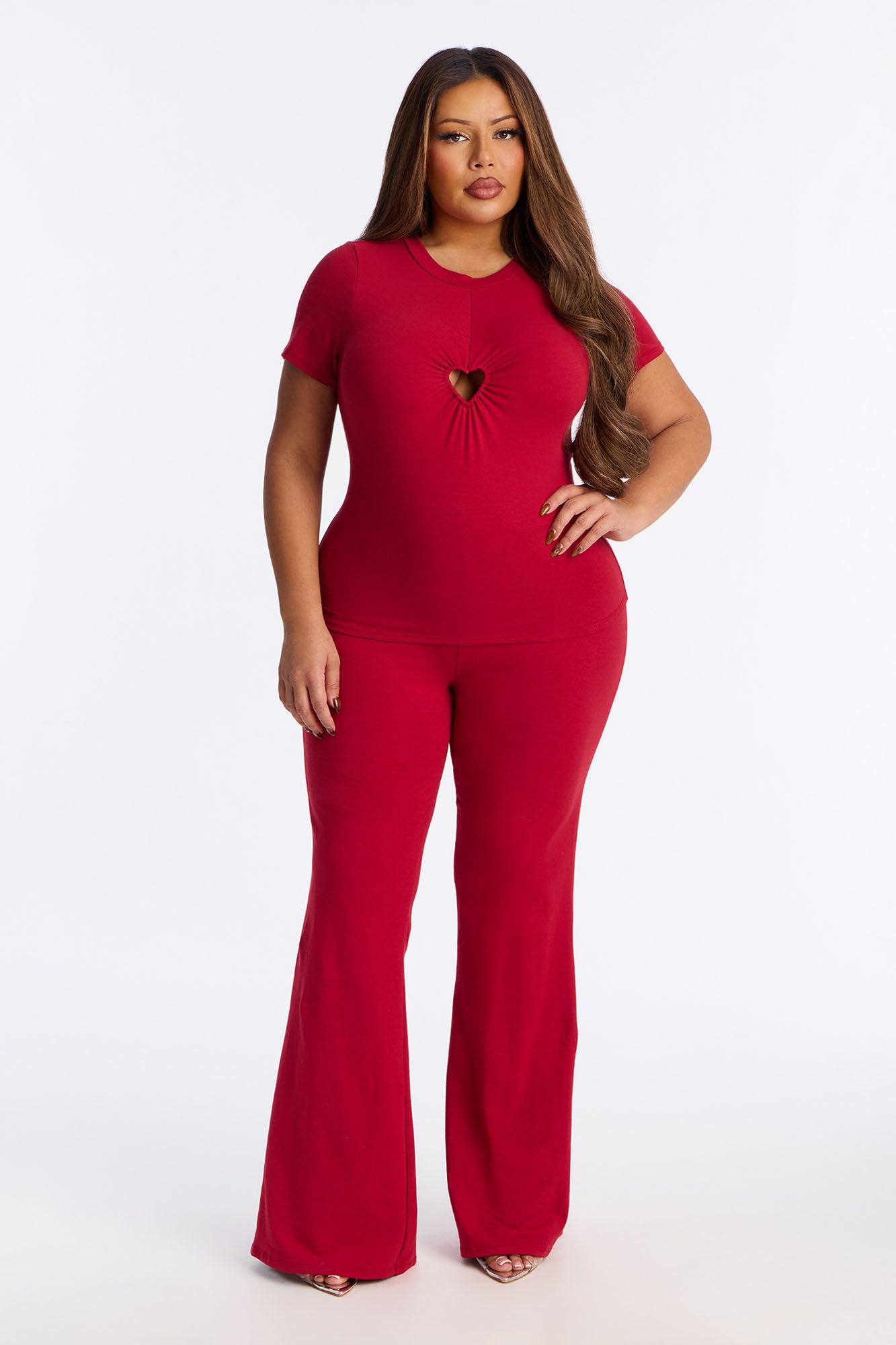 Available In Black And Red. 2 Piece Ensemble Short Sleeve And Flare Pant Set Stretch 34" Inseam Elastic Waistband Heart shaped Hardware Self : 95% Cotton 5% Spandex Imported California Proposition 65WARNING: Cancer and Reproductive Harm - www.P65Warnings.ca.gov.