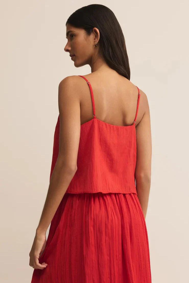 The Z Supply Fiore Crinkle Satin Tank in Cabana Red adds a bold pop to your warm-weather wardrobe. Made from lightweight crinkle satin, this elevated tank offers a breezy, relaxed fit with a deep v-neckline and adjustable straps for comfort and versatility. Whether styled with matching satin bottoms or tucked into denim, it’s a go-to for polished yet easy summer dressing.