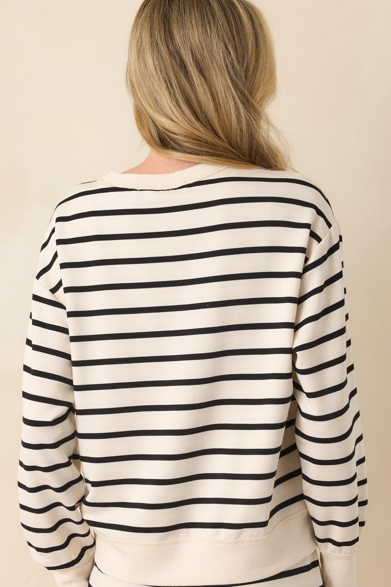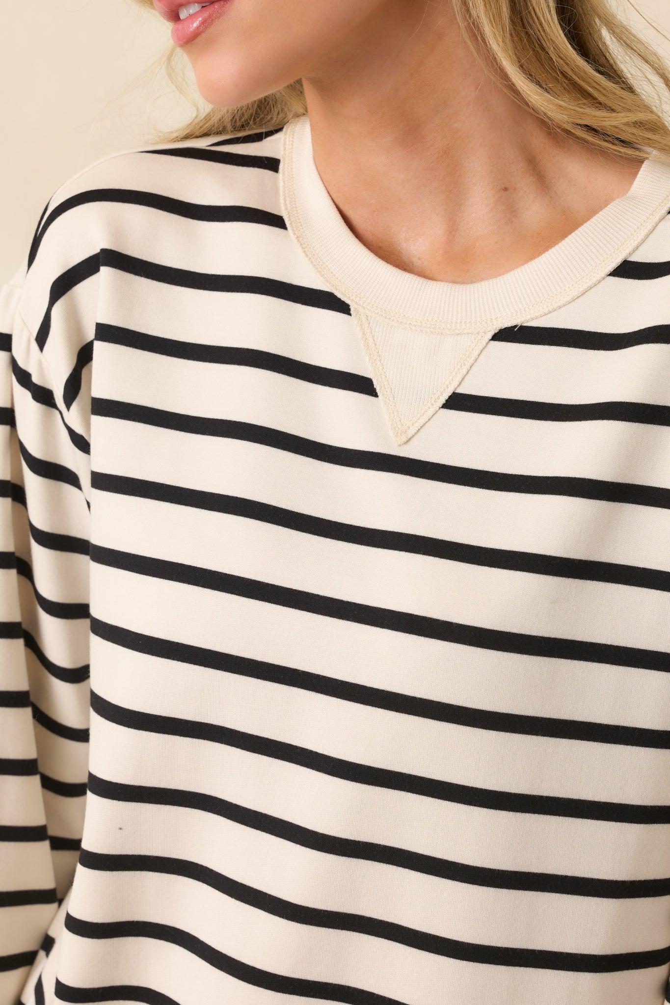 The Z Supply Light Beige Stand Out Striped Modal Sweatshirt is comfort with a little extra style built in. Easy to wear and effortlessly cool, it’s the kind of piece that makes off-duty days feel a bit more pulled together. This sweatshirt features a light beige and black stripe pattern, a crew neckline, v-stitch front insert, long sleeves, ribbed cuffs, and a relaxed fit.