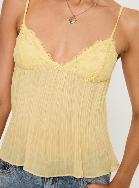 Pleat top V-neckline, lace bust, bow front detail, adjustable straps, sheer fabric Non-stretch, lined bust Princess Polly Lower Impact Main: 100% reclaimed polyester, Lace trim: 90% nylon 10% spandex, Lining: 100% polyester Cold gentle machine wash