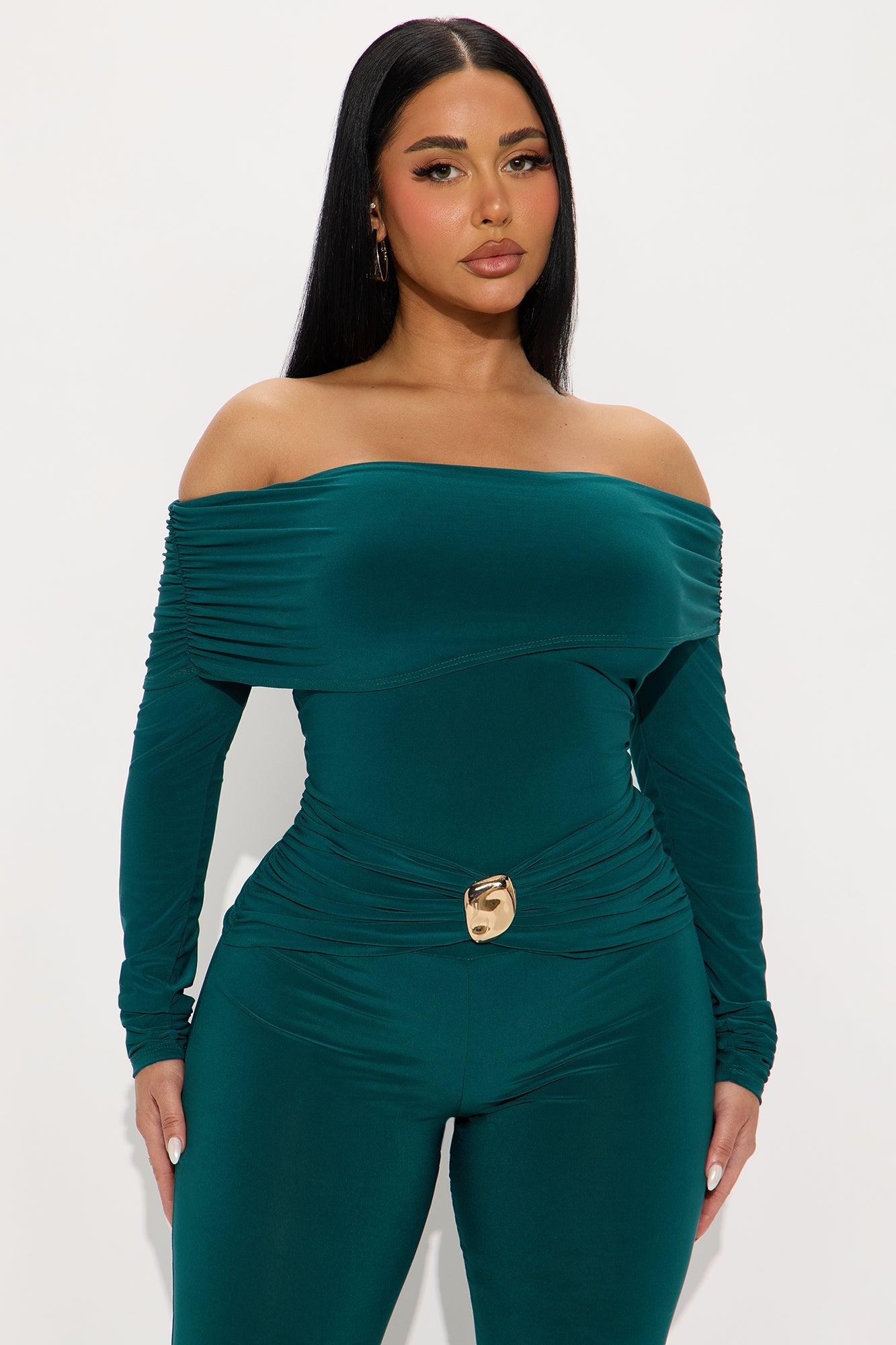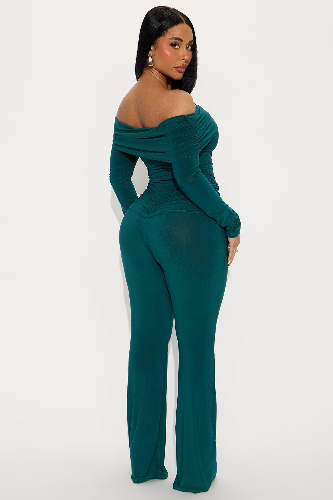 Available In Chocolate And Hunter. Jumpsuit Stretch Long Sleeve Off Shoulder Flare Leg 35.5" Inseam Self : 96% Polyester 4% Spandex Imported California Proposition 65WARNING: Cancer and Reproductive Harm - www.P65Warnings.ca.gov.