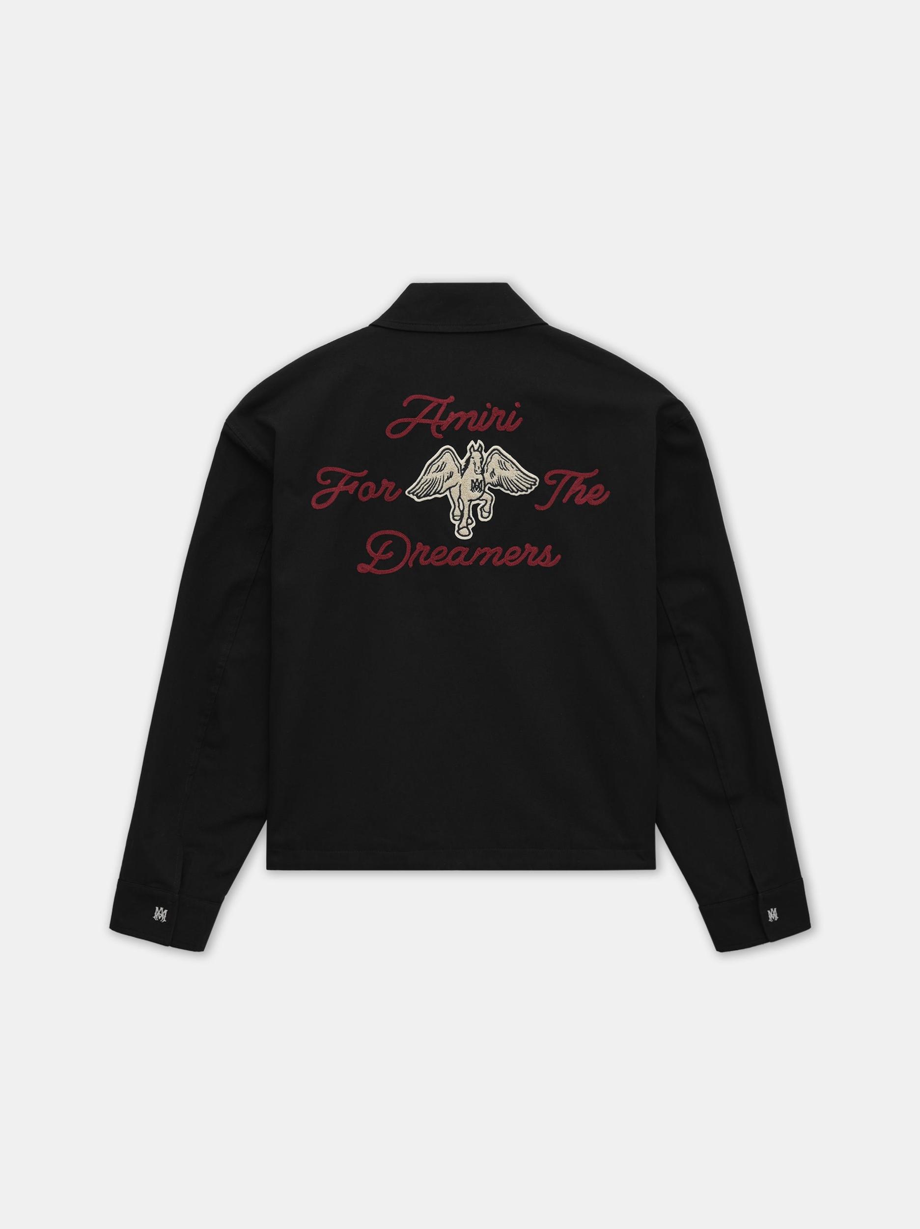 The Pegasus appears alongside a tribute to dreamers for Pre-Spring 2025. The Zip Blouson features back chenille appliqué and chain stitch embroidery and is finished with side pockets and double-zip closure. PRE-SPRING 2025 COLLECTION MADE IN ITALY 100% COTTON