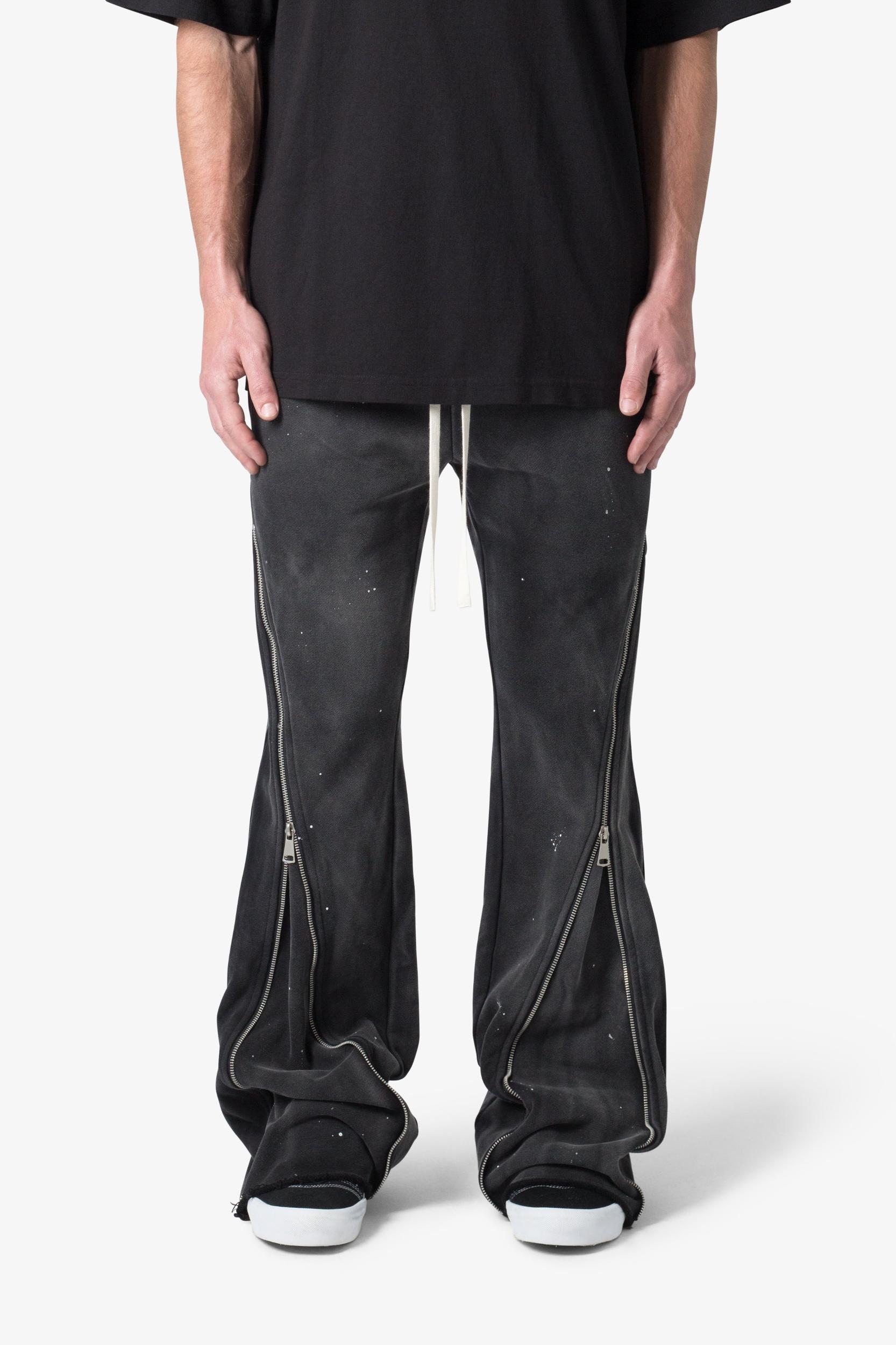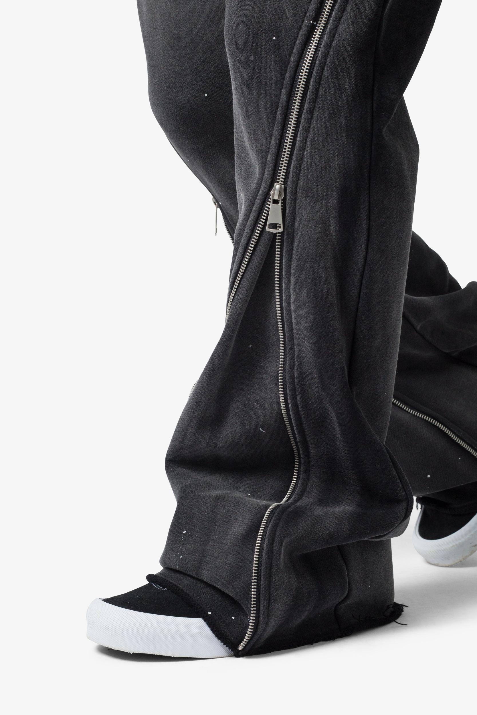 the Zipper Flare Sweatpants are designed with a relaxed fit throughout, featuring a zipper that runs from the waist to the leg opening that provides a flared fit when unzipped, an elasticized self waist, contrasting cotton drawstrings, standard hem at the leg opening, and finished in both a washed and brushed fleece fa
