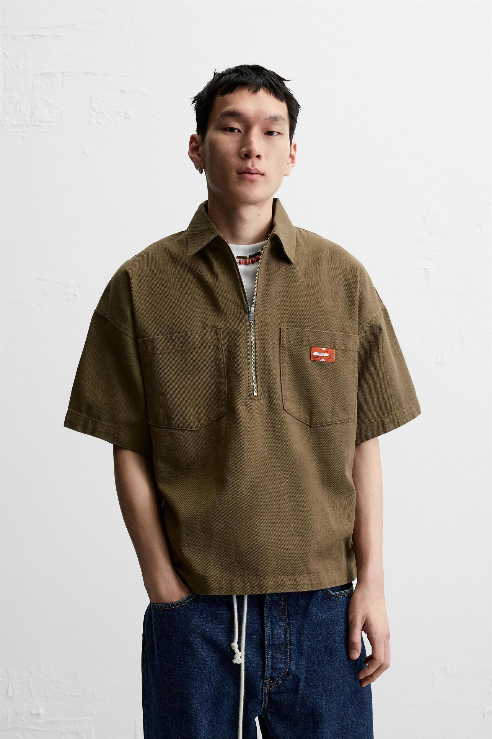 Relaxed fit polo shirt. Lapel collar with front zipper closure. Short sleeves. Patch pockets on chest.