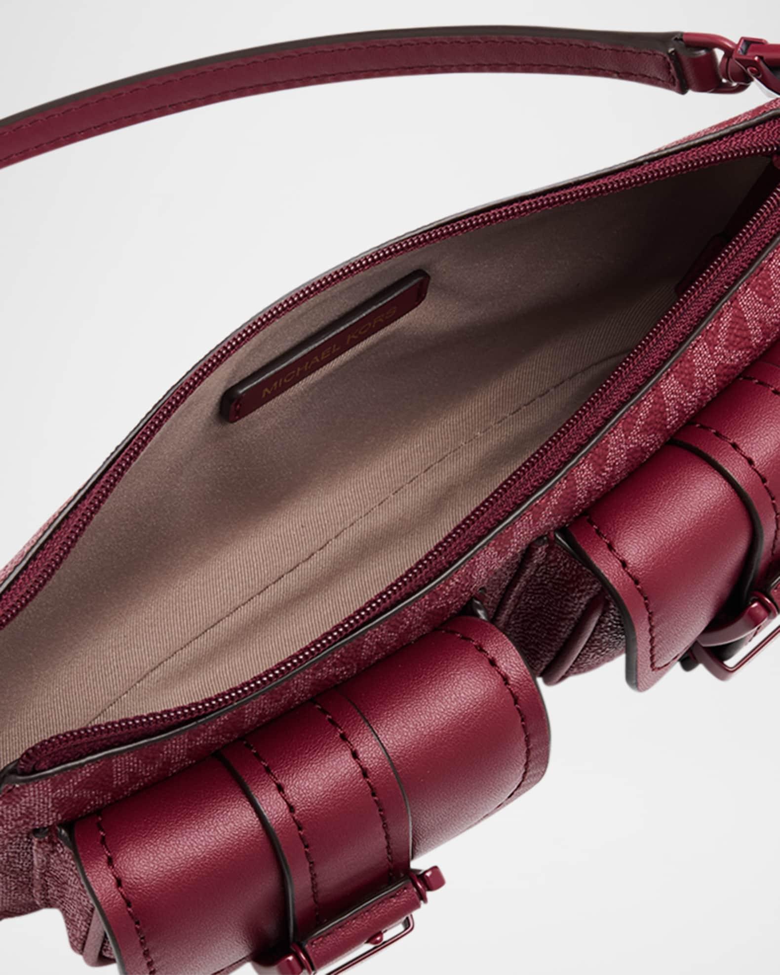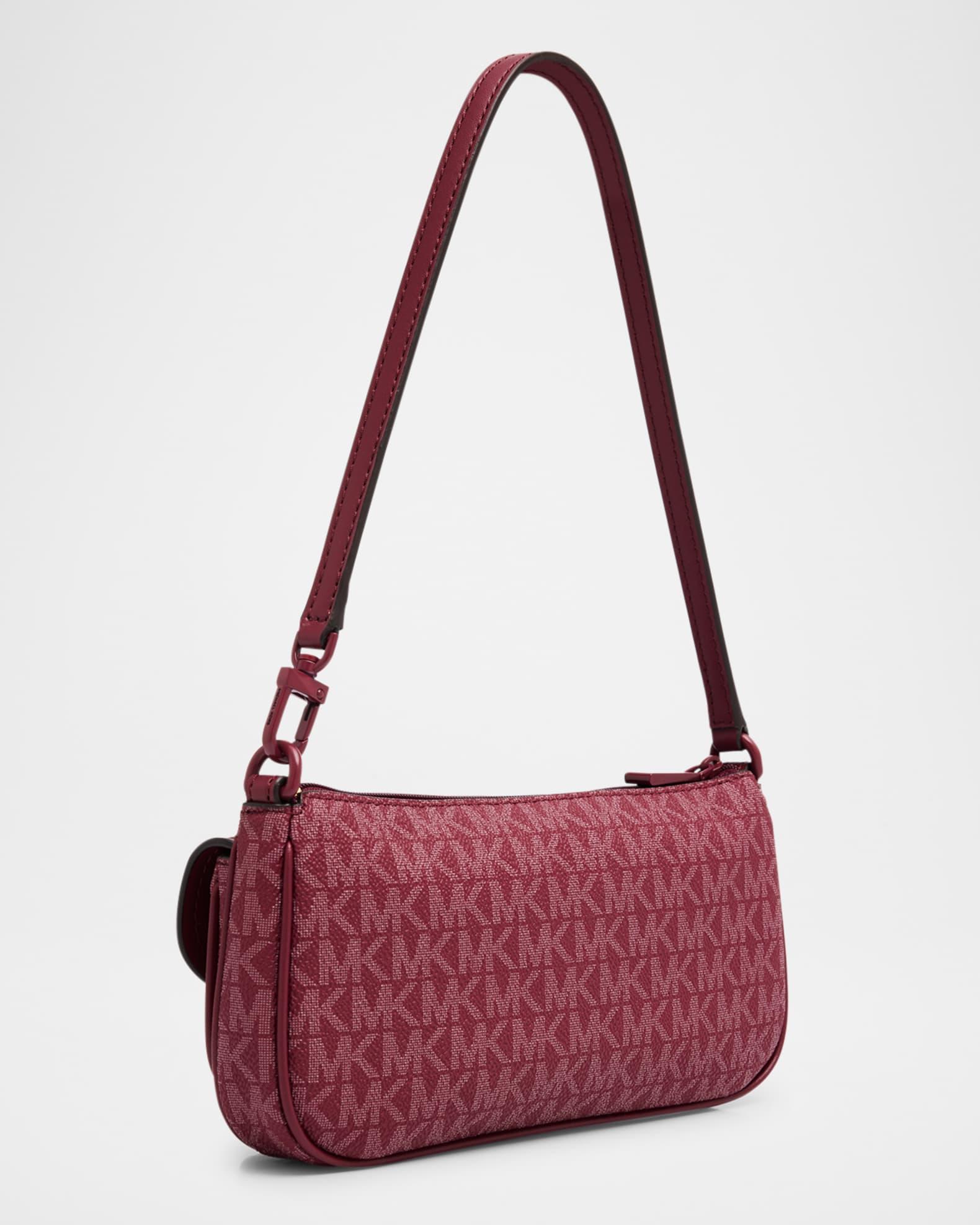 MICHAEL Michael Kors "Zoe" convertible pouchette shoulder bag in signature logo canvas and leather Shoulder strap Can be worn as a wristlet or shoulder bag Zip top closure Exterior, two flap pouches Lining: Polyester Approx. 4.3"H x 9"W x 1.8"D PVC/polyester/polyurethane Wipe clean Imported