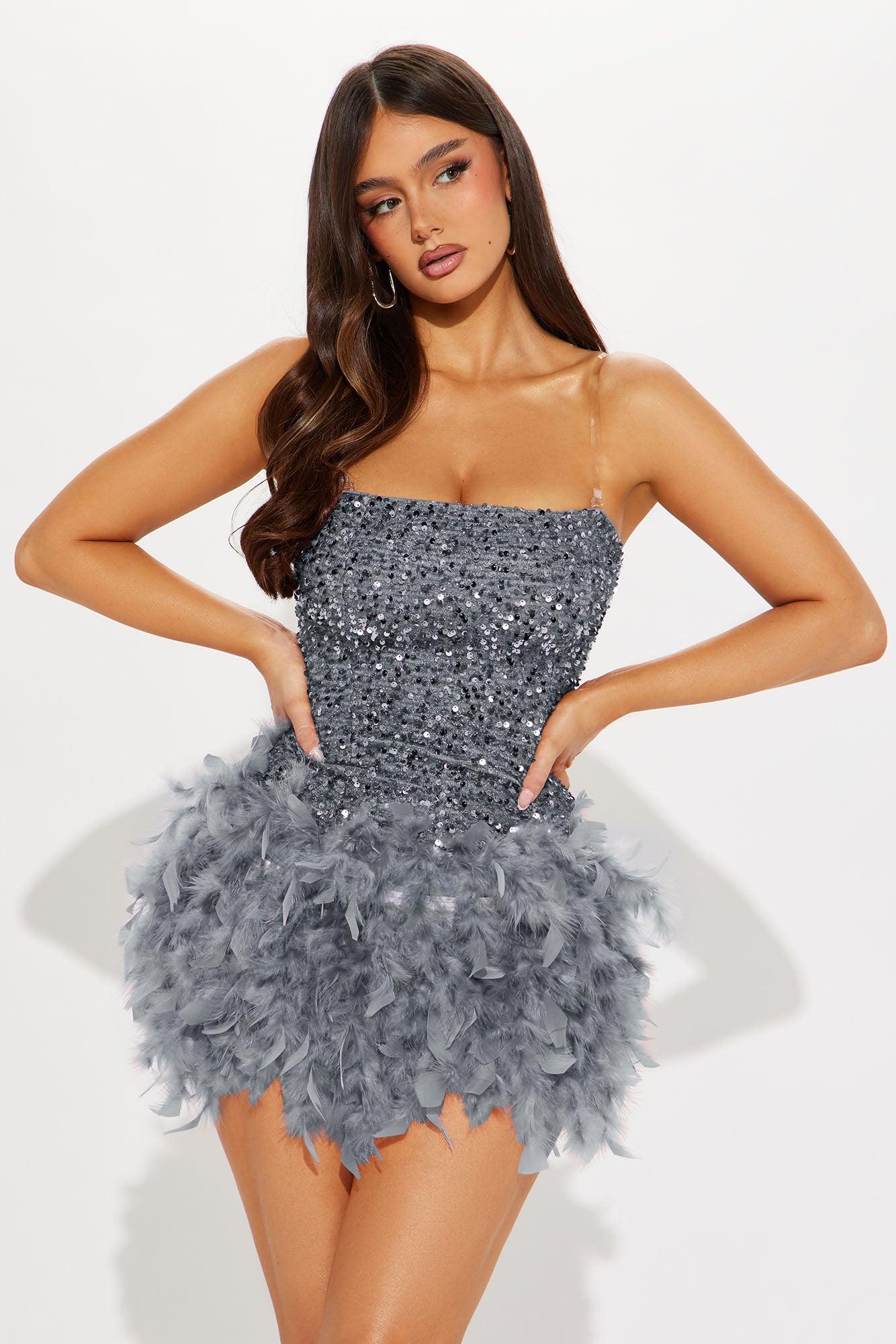 Available In Black, Grey, Mauve, White And Wine. Feathered Sequin Mini Dress Straight neckline Strapless Feather trim Back zipper Stretch Length = 31" Self: 100% Polyester Lining: 97% Polyester 3% Spandex Imported California Proposition 65WARNING: Cancer and Reproductive Harm - www.P65Warnings.ca.gov.